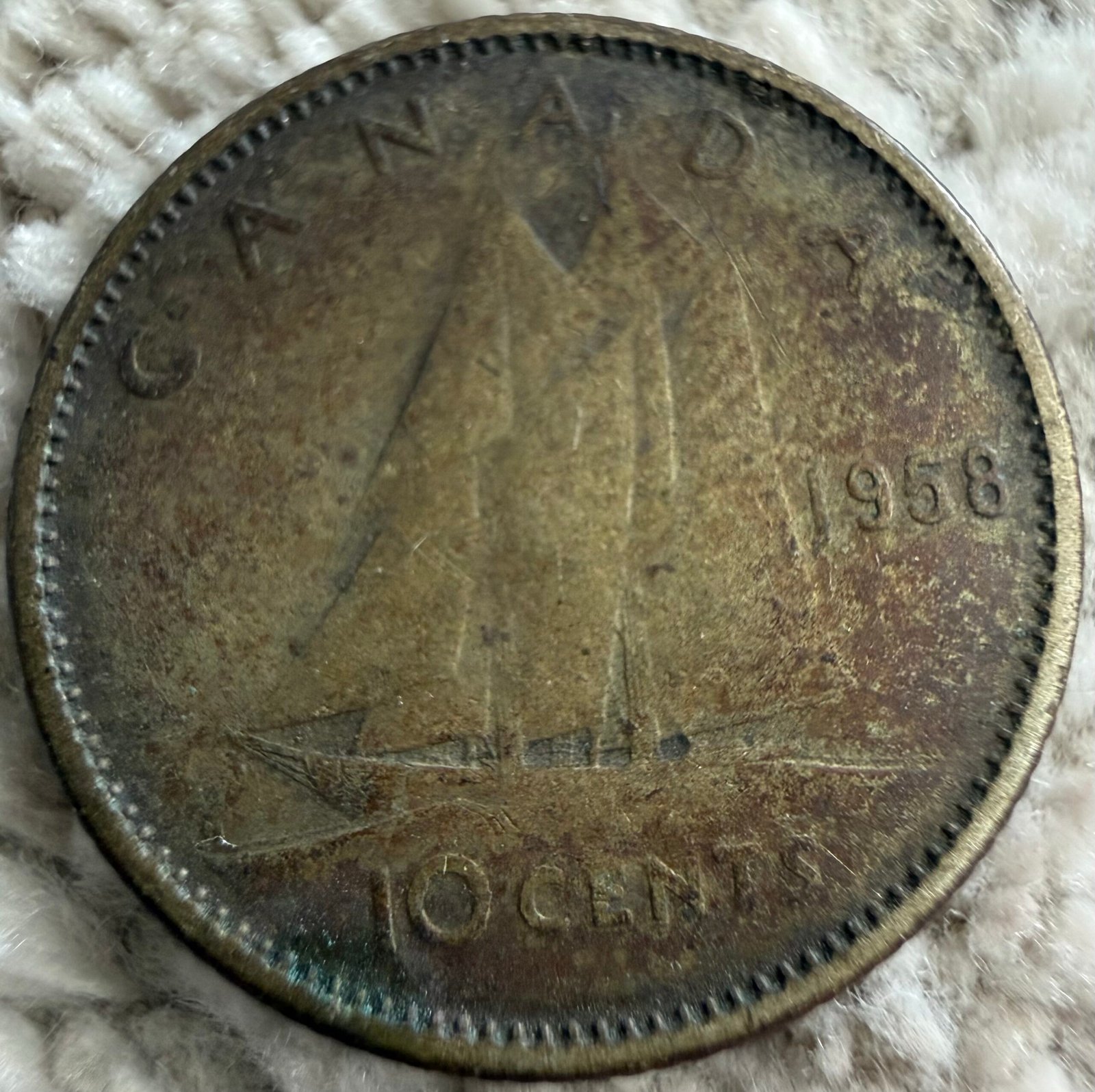 10 centavos 1958, moneda Canadá, plata 0.800, Reina Isabel II, Bluenose, Royal Canadian Mint, moneda canadiense, moneda de colección, moneda histórica, moneda de plata, KM52, Canadá siglo XX, moneda con velero, Elizabeth II, numismática canadiense, moneda real, colección numismática, moneda antigua, monedas de Canadá, plata canadiense, monedas de Isabel II, monedas británicas, rareza numismática, historia monetaria, velero Bluenose, acuñación 1958, ceca Ottawa, plata pura, monedas de colección, moneda moderna, plata histórica.