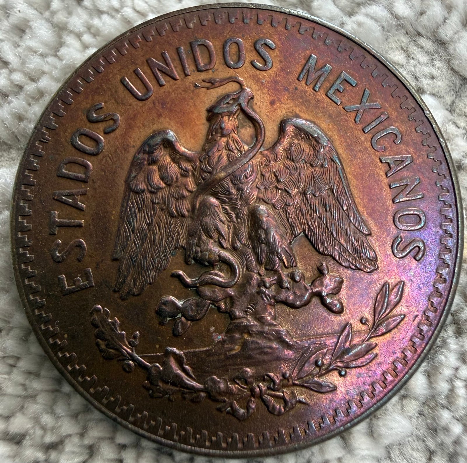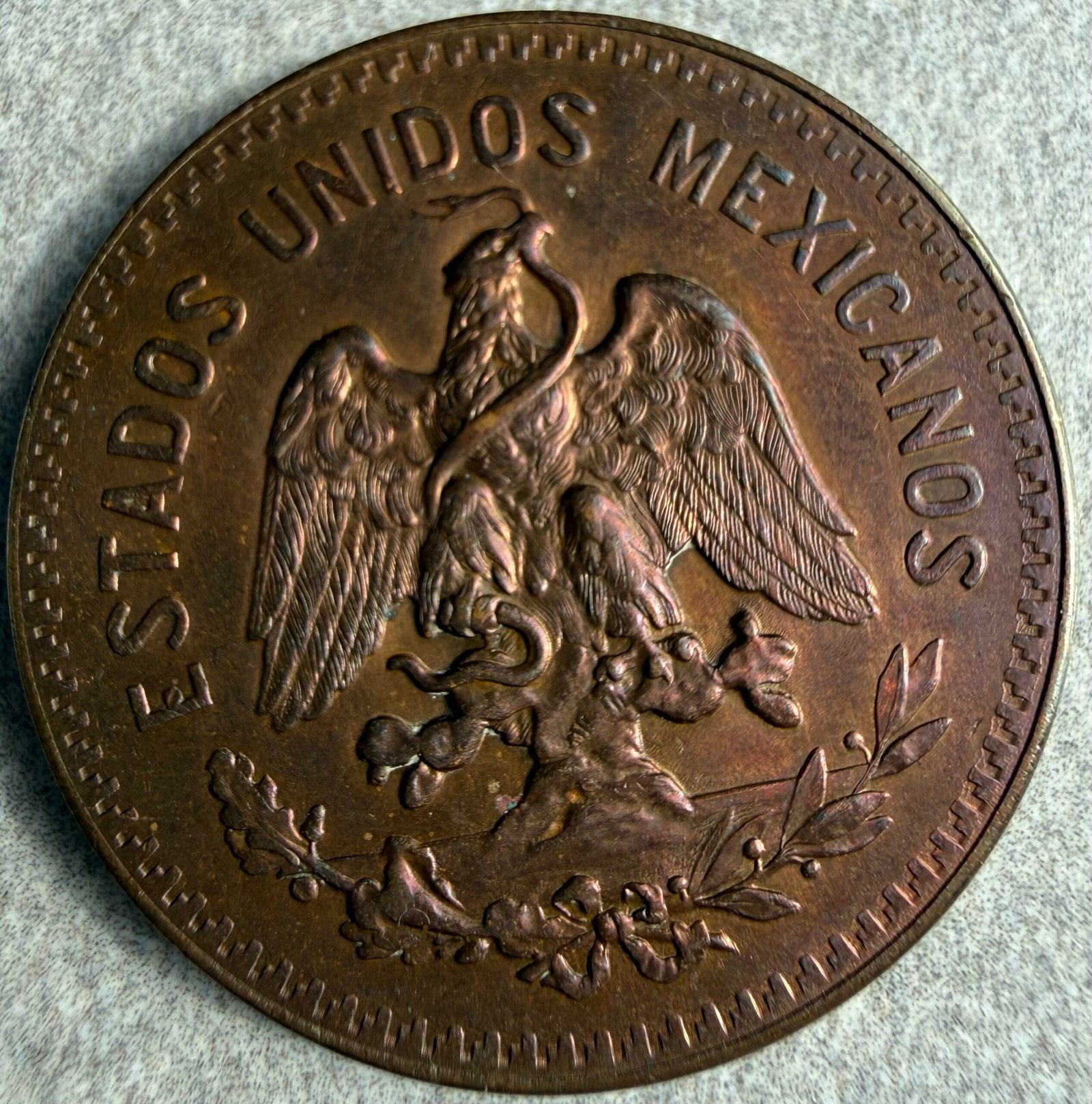 El anverso presenta el escudo nacional mexicano, con el águila real posada sobre un nopal devorando a la serpiente, rodeada por la leyenda “ESTADOS UNIDOS MEXICANOS”. Este diseño, de gran fuerza simbólica, representa la independencia, la unidad y la identidad del país.