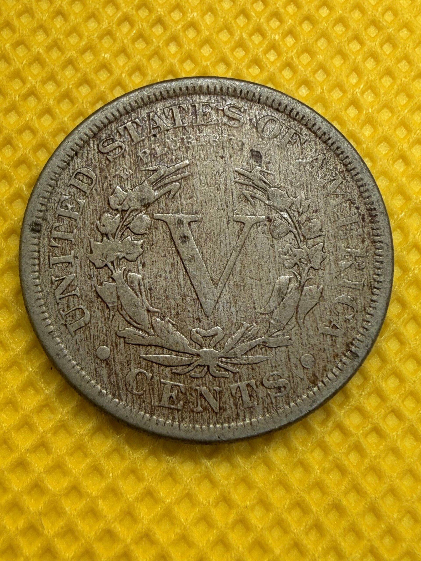 El reverso presenta una gran letra “V” (número romano cinco) en el centro, rodeada por una corona de trigo, algodón y maíz, elementos que simbolizan la prosperidad agrícola del país. En el borde se lee la inscripción “UNITED STATES OF AMERICA” y “E PLURIBUS UNUM” (“De muchos, uno”), lema tradicional de la nación. A partir de 1883, tras una breve controversia por la confusión con las monedas de oro de $5 dólares, se agregó también la leyenda “CENTS” para evitar falsificaciones, por lo que las monedas de 1888 incluyen correctamente esta inscripción.