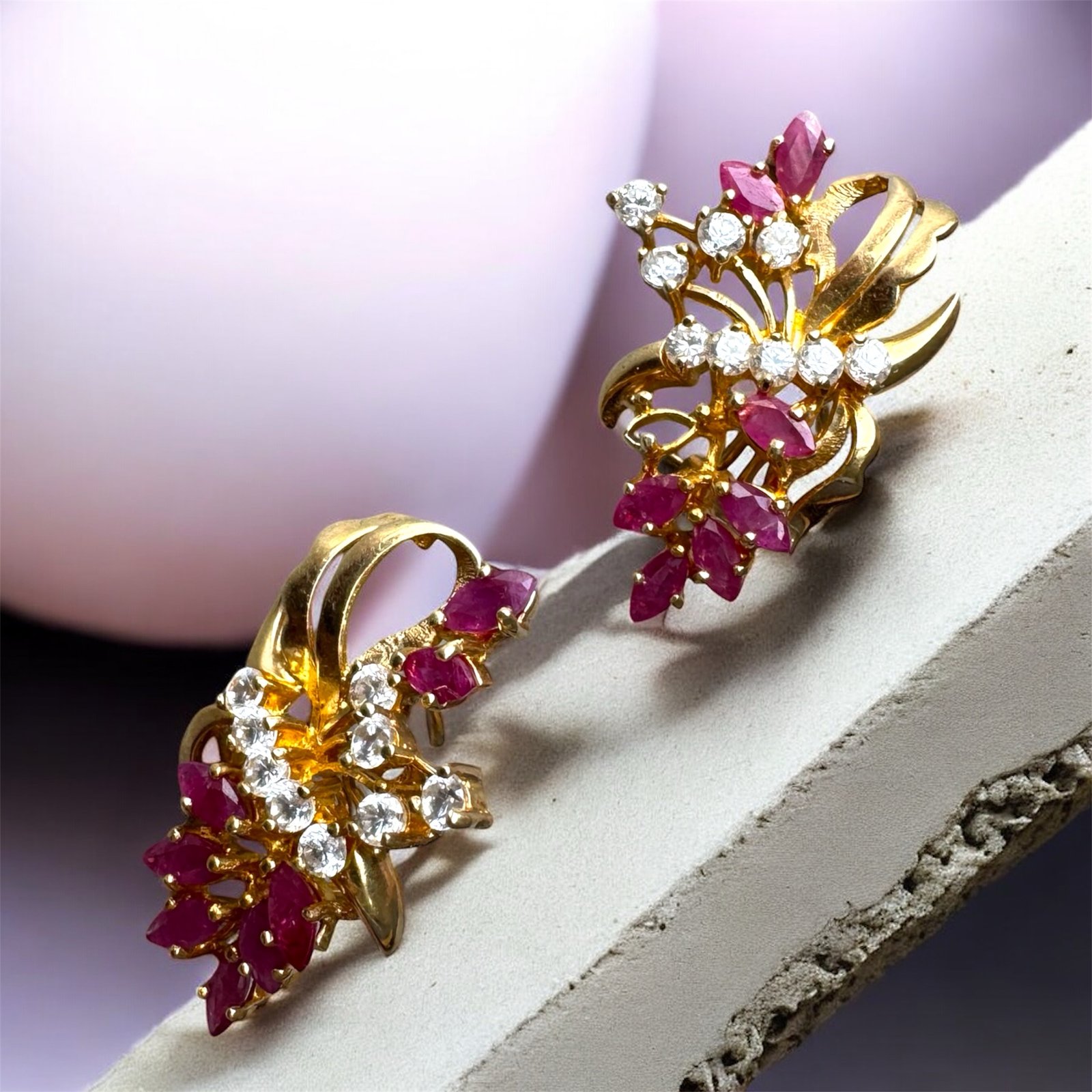 Los rubíes se distribuyen en forma de pequeñas hojas estilizadas, creando un efecto vivo y llamativo, mientras que los destellos blancos añaden un toque de elegancia que realza todo el diseño. Su tamaño alargado y proporción equilibrada permiten que destaquen sin perder comodidad.