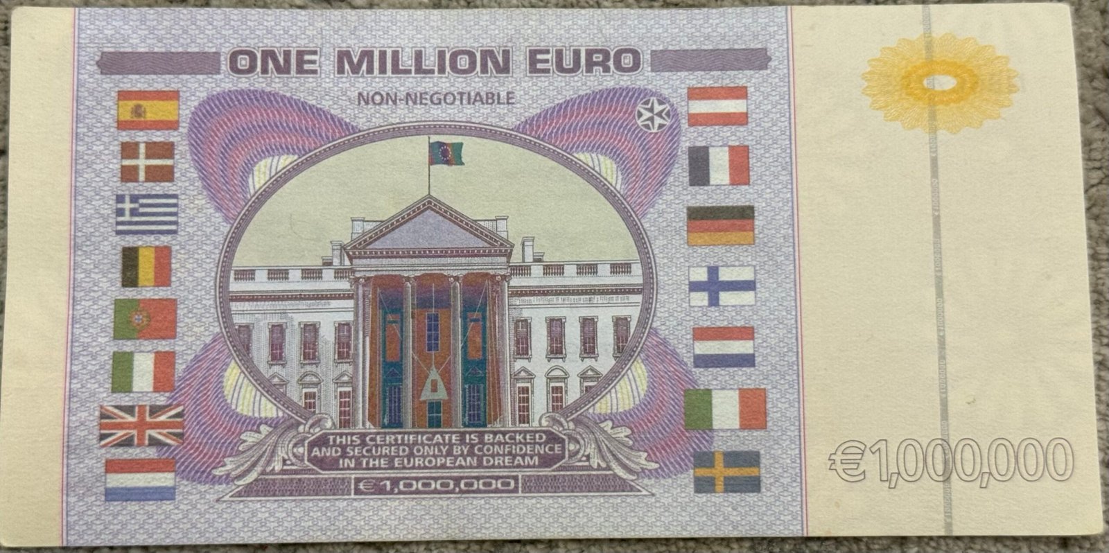 Billete conmemorativo tipo souvenir de 1.000.000 de euros, pieza llamativa ideal para coleccionistas y amantes de artículos temáticos europeos. No es de curso legal ni tiene valor monetario, pero destaca por su diseño detallado, colores vivos y elementos gráficos inspirados en la iconografía de Europa.