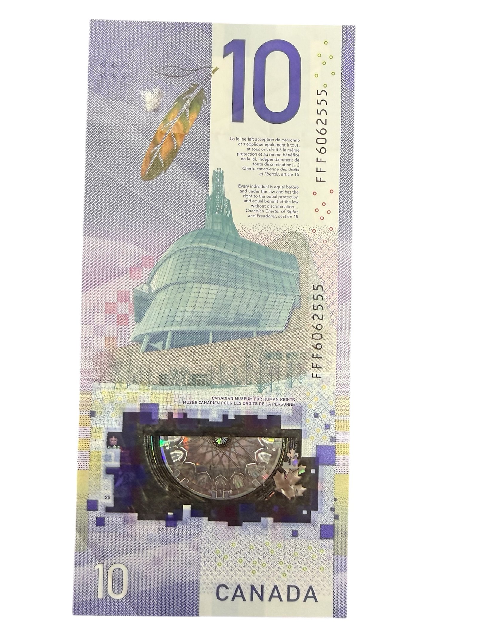 En el reverso aparece el Canadian Museum for Human Rights (Museo Canadiense de Derechos Humanos), ubicado en Winnipeg.