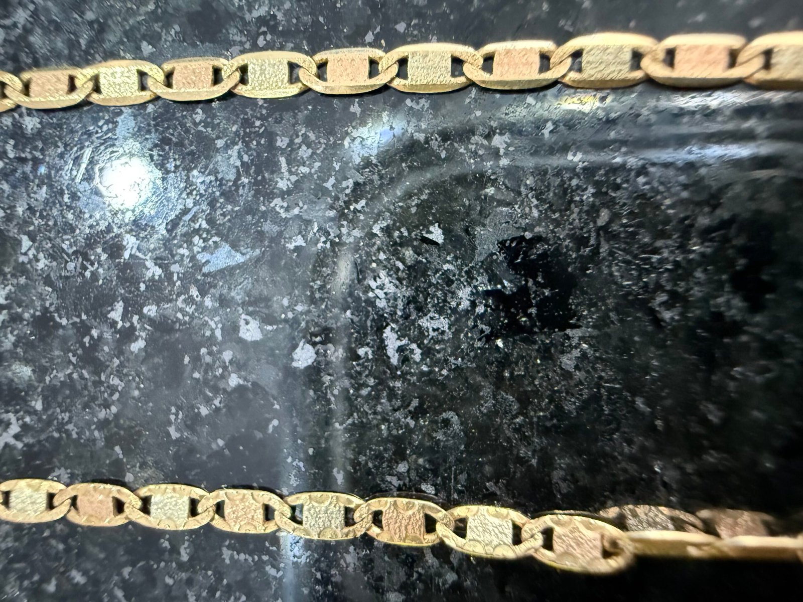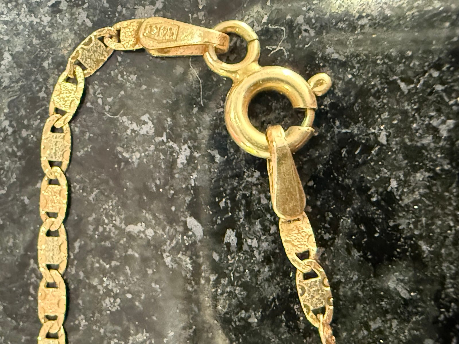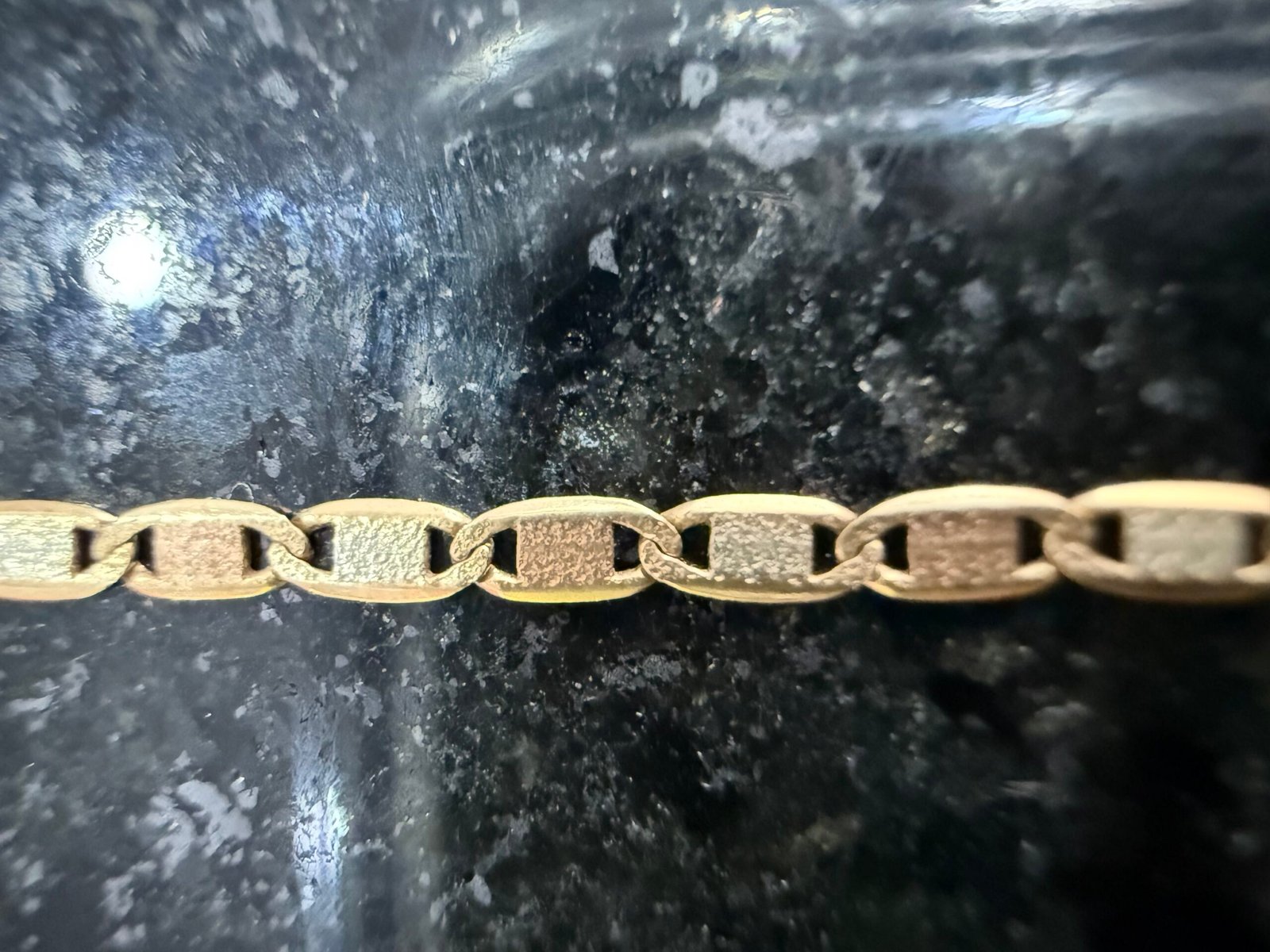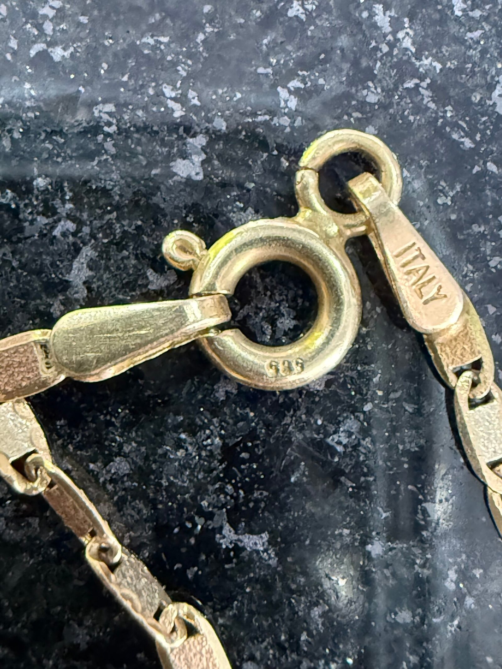 Cadena fina Italiana y elegante elaborada en oro sólido de 14 quilates, diseñada con eslabones alargados y un acabado texturizado tipo martillado que le da un brillo único y un estilo distintivo. Su construcción ligera y detallada la convierte en una pieza ideal para uso diario o para complementar dijes pequeños sin perder presencia.