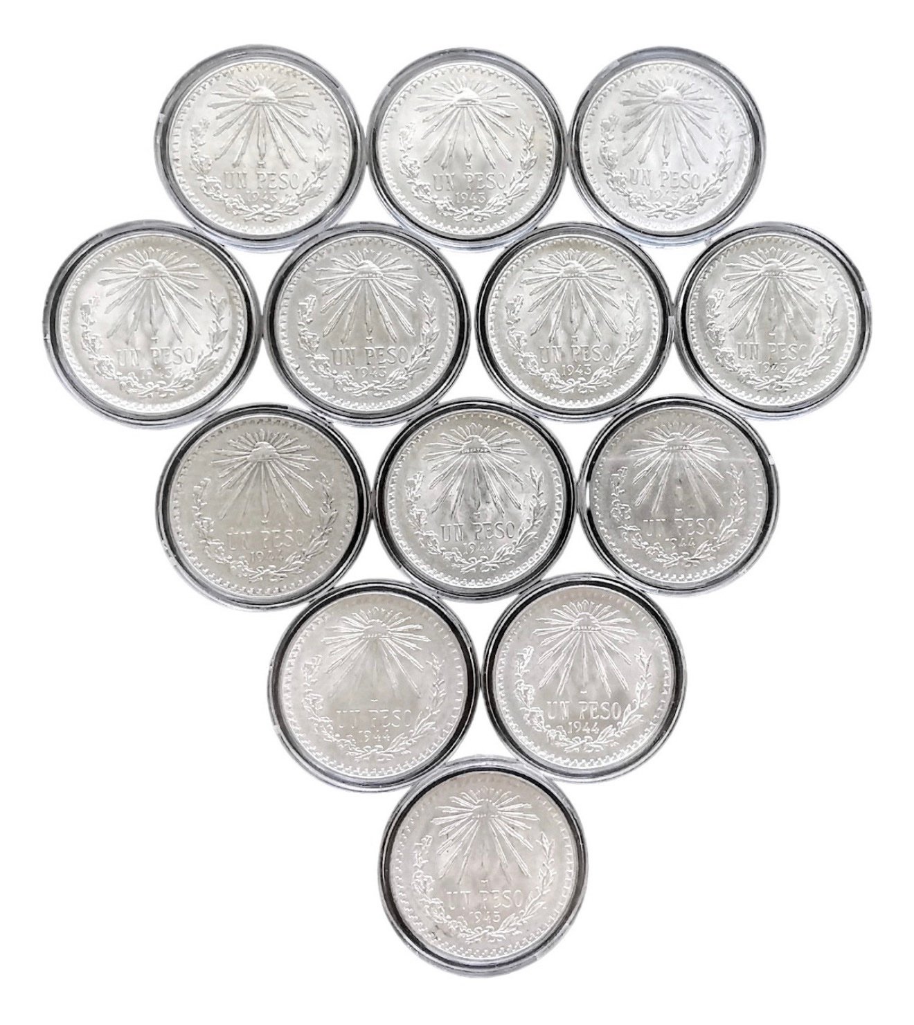 Lote de 13 monedas originales Peso Resplandor de plata Ley 0.720 de 1943, 1944 y 1945, brillantes y auténticas, ideales como arras matrimoniales, inversión o regalo especial.