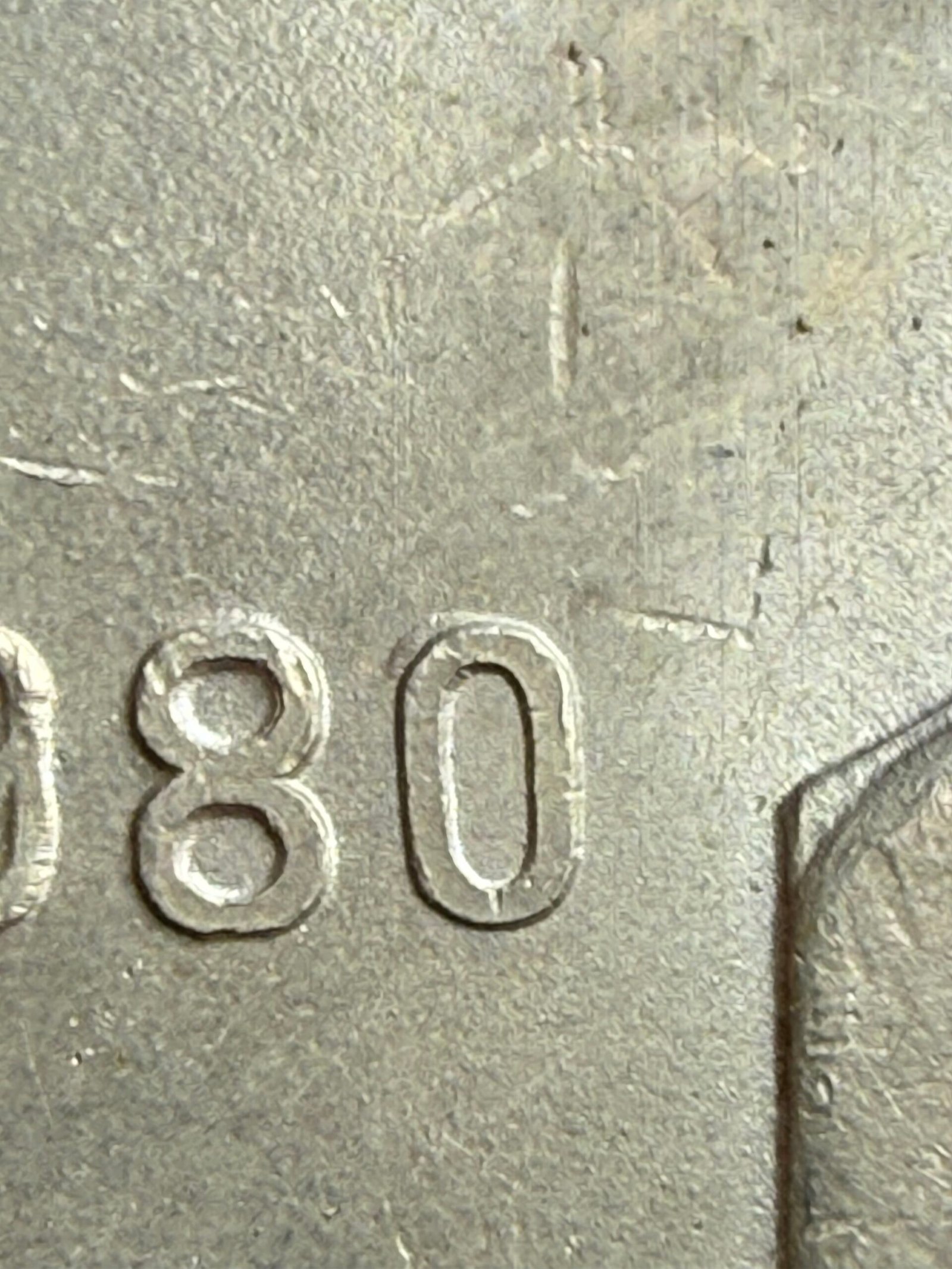 Lo que hace realmente especial a esta moneda es su sobrefecha “1980/9”, una variante extremadamente rara en la que el dígito final del año “0” fue grabado sobre un “9”, generando un rasgo visible que los expertos reconocen como error o variante de acuñación. Estas sobrefechas suelen producirse cuando los cuños se reutilizan o corrigen manualmente, por lo que cada ejemplar es único y valioso.